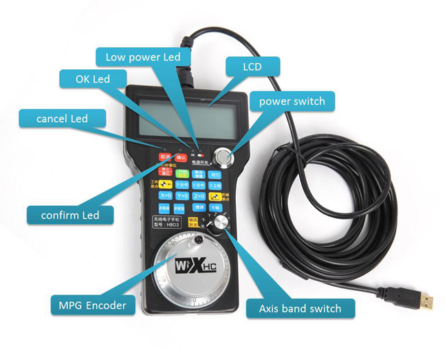 To choose X/Y/Z axis or close all axis by axis switch, to adjust feed or spindle speed, to run or step g code file by mpg.